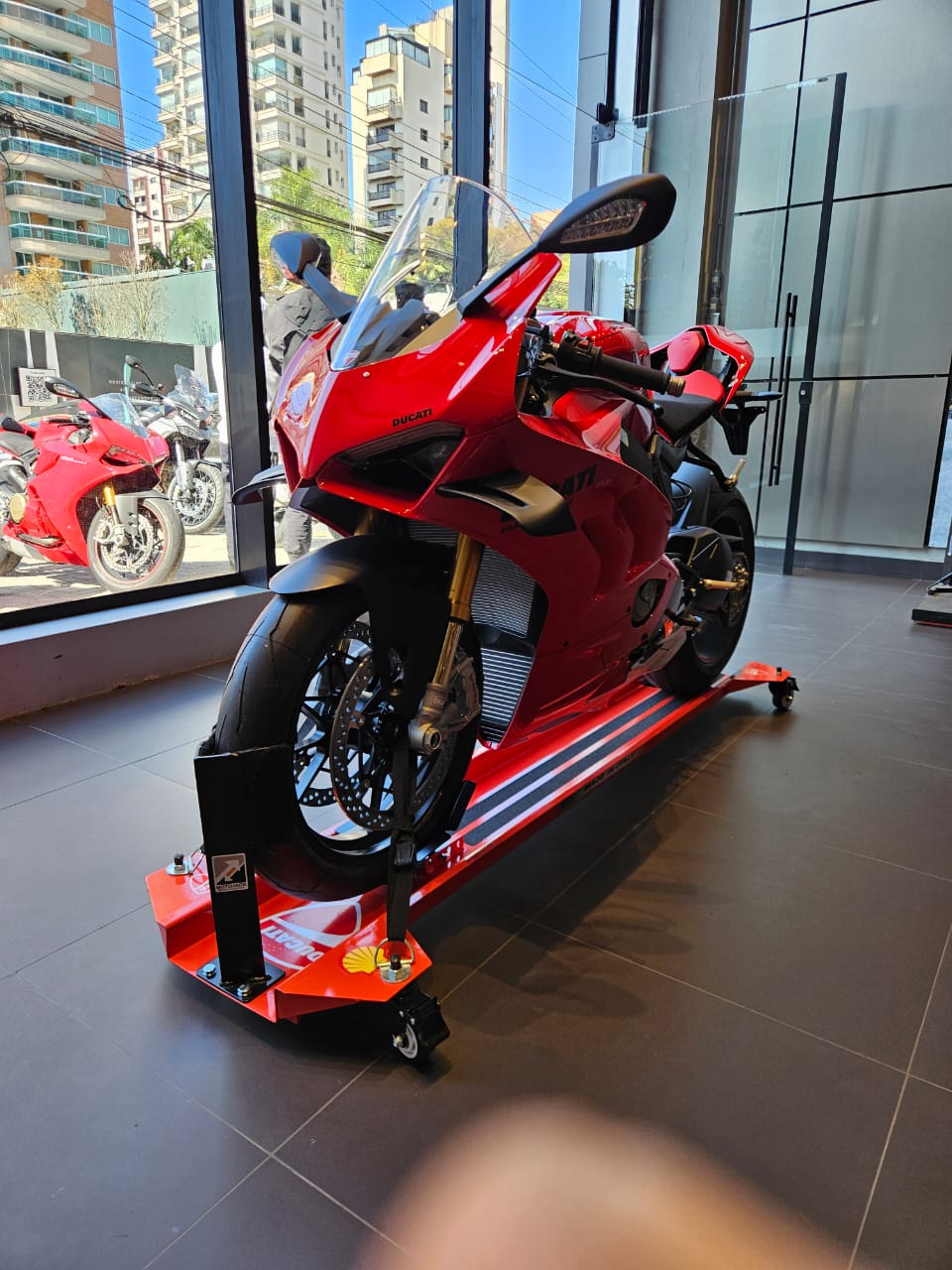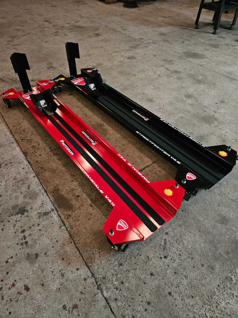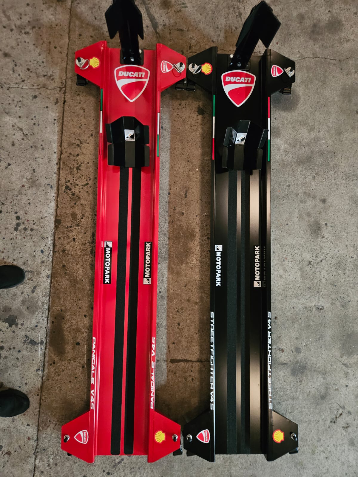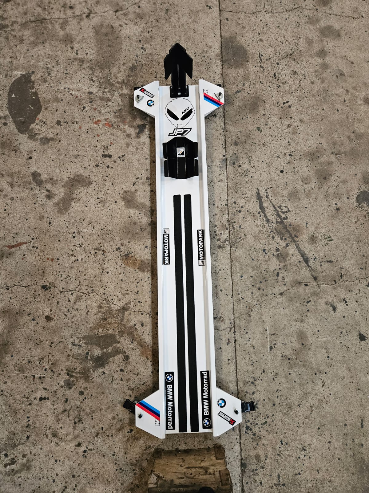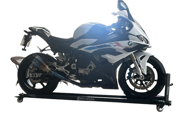 O MOTOPARK tem estrutura em chapa de aço, dimensões 2,0 X 0,55 m, peso aproximado 28kg, 4 rodízios 360° de 3″ anti risco com freio, trava de roda com regulagem do aro 14″ a 21″ através de um pino com rosca e bumper acarretado. O único contato da moto com o dispositivo é através do pneu. Pintura epoxi cor preto, lixa anti derrapante, dois ganchos, duas cintas acompanham o produto.  Capacidade de carga até 350kg.